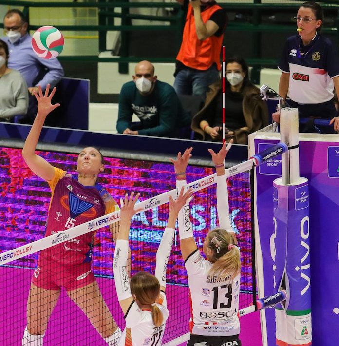 Bergamo jumped out of the relegation zone after a 25-23, 31-29, 25-19 sweep of Roma. Khalia Lanier was the match’s top scorer with 26 points. Lanier had 22 kills (.400), three blocks, and an ace. Mac May had two kills (.125) in two sets. Madison Bugg had two aces and a block for Roma, which hit .167. Bergamo improved to 5-15 with 16 points while Roma fell to 6-15, also with 16 points.