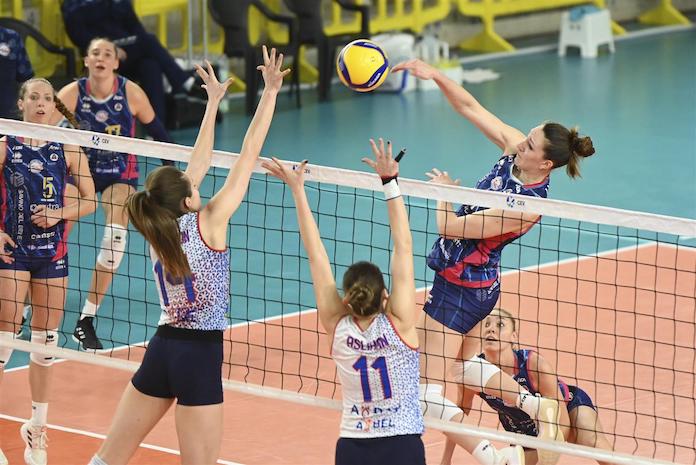 In a mid-week clash, Novara beat Imoco Conegliano for the first time since 2019, winning 25-19, 25-21, 23-25, 25-19. Micha Hancock had four kills, one block, and an ace as she excellently set Novara, which hit .367. Haleigh Washington finished with five kills (.231) and two blocks. Kathryn Plummer had 14 kills (.367), one block, and an ace for Imoco. Megan Courtney-Lush added nine kills (.304).