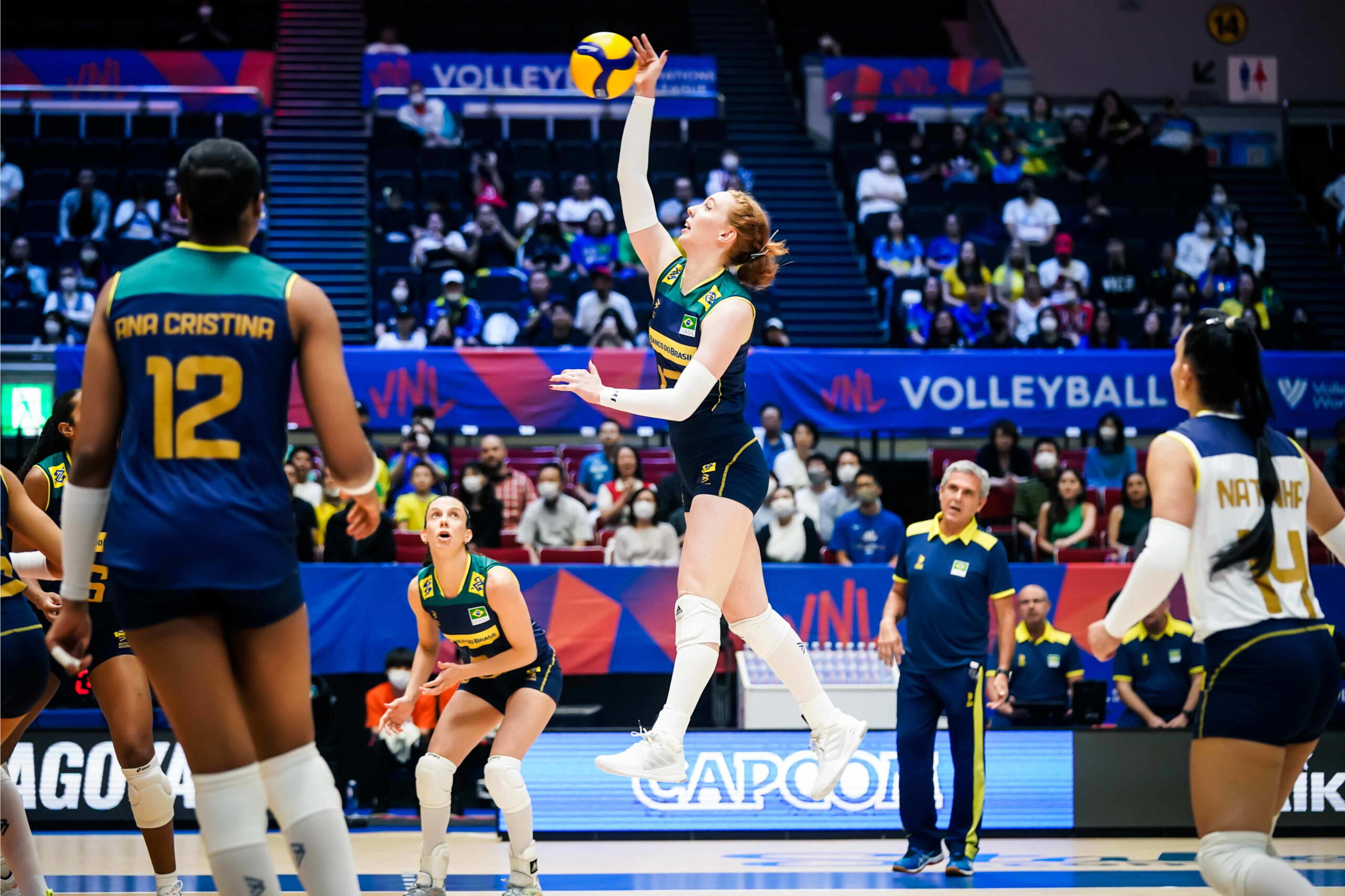 Brazil’s Kisy Nascimento had 16 kills, four blocks and an ace. Ana Christina had 16 kills and a block, Diana Duarte had 14 kills, a block and an ace, and former Georgia Tech star Julia Bergmann had 15 kills and a block. Natalia Araujo had 14 digs.