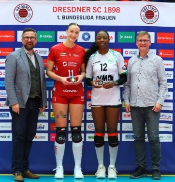 Dresdner (10-2) won its third in a row, beating Munster (3-9) in four. Grace Frohling was gold MVP after getting 21 kills, two aces and a block. Dresder teammate Tia Jimerson added six kills, two blocks and an ace. Gloria Mutiri was named silver MVP with19 kills, two blocks and an ace for Munster. Zoe Fleck was credited with 62% positive reception. Setter Jenna Ewert had one kill and an ace.