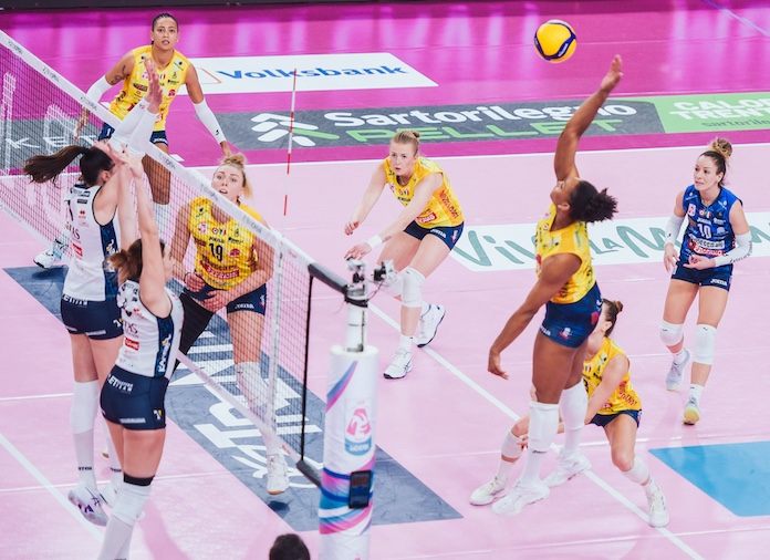Kelsey Robinson Cook had 14 kills, hit .480 and had an ace and Khalia Lanier had 12 kills, hit .429 and had an ace as Imoco Conegliano (14-0) swept Trentino (1-13). Carly DeHoog led Trentino with 13 kills and a block.