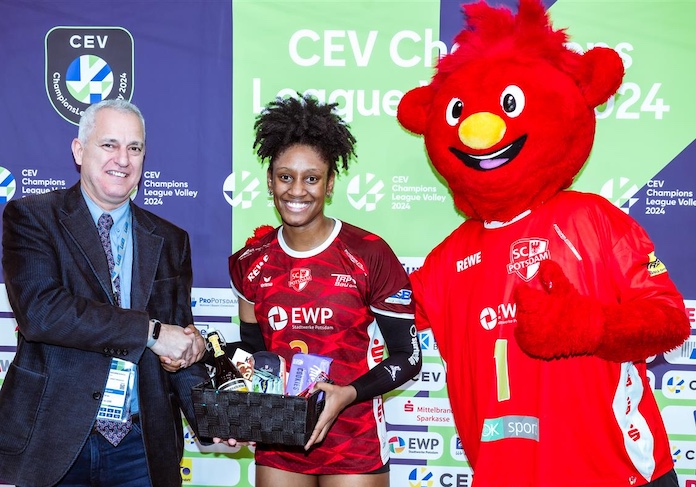 Danille Harbin was the MVP with 19 kills and a block as Potsdam (3-2) earned a vital win in Pool C by beating Budowlani Lodz (2-3). Breland Morrissette had a team-high three aces and a kill and a block. Justine Wong-Orantes was credited with 50% positive reception. Mac May finished with eight kills and three aces for Lodz.